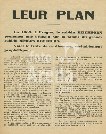ado00102942 Front of a leaflet containing the ideas of a speech known as "the speech of the rabbi" (that of Rabbi Eichhorn or Reichhorn), aimed at making people believe in a conspiracy theory which lends to the Jews a will to dominate the world. Leaflet issued by the Anti-Jewish Rally of France, around 1936. Author: UNKNOWN ARTIST.