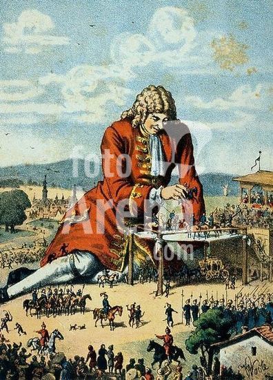 akg043495 Swift, Jonathan; Anglo-Irish writer. 1667-1745. Works: Gulliver's Travels (1726). Gulliver in the land of Lilliput. Colour lithography after watercolour by Oskar Woite (born 1854). From: Die Reisen Gullivers, für die Jugend bearbeitet von Bertram Grimm, Berlin. (Verlag C.J.Leo), 1882. Berlin, Sammlung Archiv für Kunst und Geschichte. Museum: Berlin, Sammlung Archiv für Kunst und Geschichte.