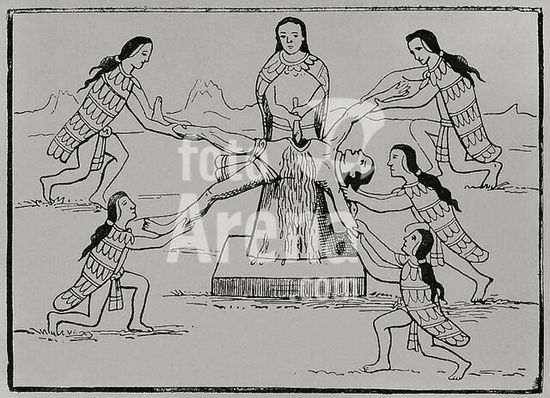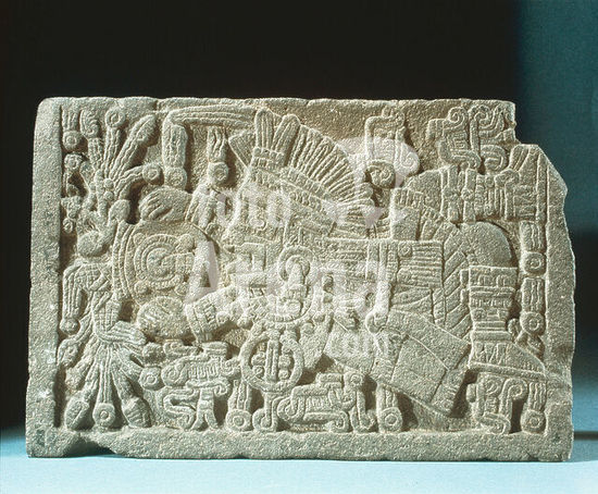 Aztec. Mexico, 1325 -1521 AD. Tlaloc, the Mexican Rain God, pours water from a vessel. Stone relief on the basis of a fragment of a stone box (tepetlacalli). This box has been associated with Ahuitzotl, the eighth ruler (1486-1502) of the Mexican capital Tenochtitlan. London, British Museum. Museum: London, British Museum.
