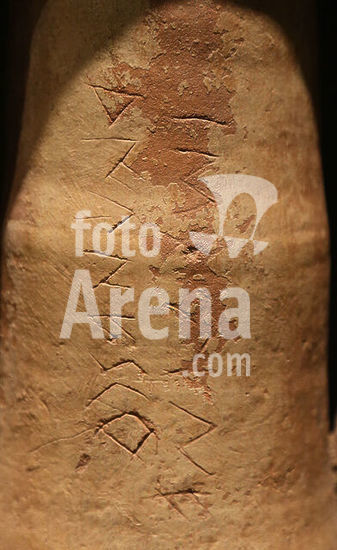 alb11640800 Romanization of Hispania. Wine amphora. Clay. 2nd -1st century BC. Cabezo de Alcala, Spain. Iberian Script. Detail sgraffito signs. National Archaeological Museum, Madrid. Spain.