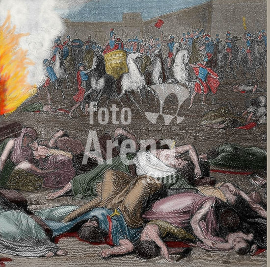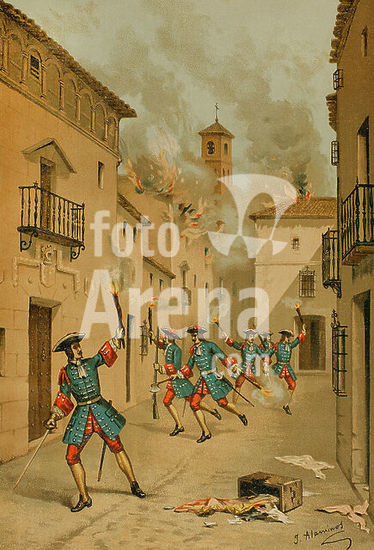 alb5433394 History of Spain. War of the Spanish Succession. Siege of Játiva (8 May to 6 June 1707). After the victory of Philip V's Bourbon troops, he ordered the burning of all the houses owned or occupied by those who had been hostile to him in the town, an action that was executed by the French troops of d'Asfeld. Destruction of Játiva. Illustration by J. Alaminos. Chromolithography. "Historia General de España" (General History of Spain) by Miguel Morayta. Volume V. Madrid, 1891. Author: Juan Alaminos. Spanish artist of the second half of the 19th century.