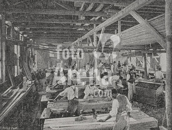 alb20427543 South Africa. Lovedale, also known as Lovedale Missionary Institute. Mission station founded in 1824 by the Glasgow Missionary Society (GMS), named in honour of Dr John Love (1757-1825), one of the leading members and at the time secretary to the society. Carpentry workshop at Lovedale. Photogravure by André & Sleigh. "La conquista de Africa" (The conquest of Africa), by Alfredo Opisso. Volume III. Published in Barcelona (Spain) by Molinas y Maza editores, 1911.