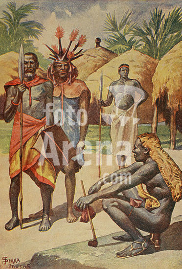 alb20427557 Zimbabwe. Ndebele warriors. Illustration by Serra Pausas. Chromolithograph. "La conquista de Africa" (The conquest of Africa), by Alfredo Opisso. Volume III. Published in Barcelona (Spain) by Molinas y Maza editores, 1911. Author: Joan Serra Pausas (active 1861-1902). Spanish artist.