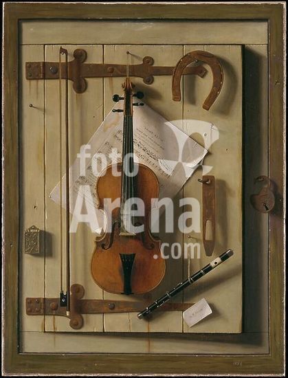 alb3605196 Still Life--Violin and Music. Artist: William Michael Harnett (1848-1892). Dimensions: 40 x 30 in. (101.6 x 76.2 cm). Date: 1888.Harnett was the most imitated and skillful still-life painter in late nineteenth-century America, celebrated for his many arrangements that pushed the art of trompe l'oeil (French for "fool the eye") to its limits. While this complex composition may at first appear flat, it is full of depth and plasticity, emphasizing the tension between illusion and reality. The depicted hinged door is slightly ajar, and the humble objects hang on prominent nails, casting strong shadows. The instruments and torn sheet music for a popular Irish reel underline Harnett's humorous sense of play as well as his Irish-American identity. Museum: Metropolitan Museum of Art, New York, USA.