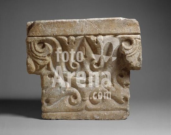 alb3605595 Capital. Dimensions: H. 13 3/4 in. (34.9 cm)W. 15 1/4 in. (38.7 cm)D. 8 in. (20.3 cm)Wt. 104 lbs (47.2 kg). Date: late 8th century.This object exhibits the decorative language of Samarra, the second and temporary Abbasid capital. Among the various styles of surface ornament created at Samarra, the beveled style is the most well known. This style refers to a form of ornamentation based on a vegetal design that was slant cut so that the foreground and background become almost indistinguishable. Museum: Metropolitan Museum of Art, New York, USA.
