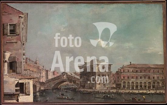 alb3611894 The Grand Canal above the Rialto. Artist: Francesco Guardi (Italian, Venice 1712-1793 Venice). Dimensions: 21 x 33 3/4 in. (53.3 x 85.7 cm). Date: late 1760s.Guardi depicts the Rialto Bridge with the Palazzo dei Camerlenghi, and, on the right, the vegetable market. He has created an effect of snapshot-like immediacy by arbitrarily cropping the house and palace at the left. Museum: Metropolitan Museum of Art, New York, USA.