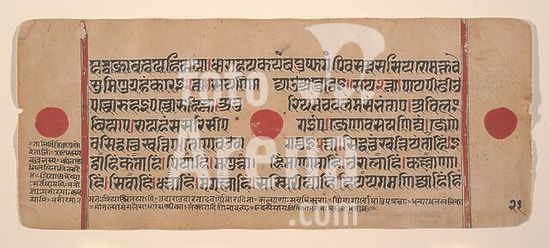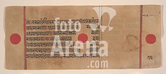 alb3625665 Page from a Dispersed Kalpa Sutra (Jain Book of Rituals). Culture: India (Gujarat). Dimensions: 4 3/8 x 10 5/8 in. (11.1 x 27 cm). Date: 15th century. Museum: Metropolitan Museum of Art, New York, USA.