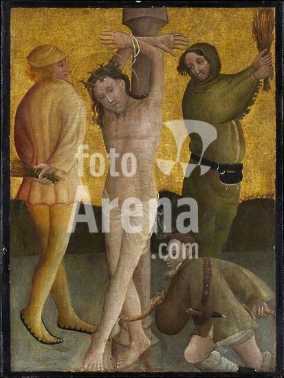 alb3619466 The Flagellation. Artist: Master of the Berswordt Altar (German, Westphalian, active ca. 1400-35). Dimensions: 22 3/4 x 16 7/8 in. (57.8 x 42.9 cm). Date: ca. 1400.These panels were among thirty scenes of an extensive narrative cycle that formed part of a large altarpiece from the Neustädter Marienkirche in Bielefeld, Westphalia. They were created two decades before panel painting underwent a qualitative revolution in the art of Jan van Eyck, Robert Campin and Rogier van der Weyden, who achieved a new sense of realism in their works. The artist, one of the foremost painters of the International Gothic style in northwest Germany, still adhered to the traditional gilded background, although the inclusion of a horizon and some schematic natural motifs indicate an outdoor setting for both scenes. Museum: Metropolitan Museum of Art, New York, USA.