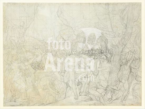 alb3619664 Leonidas at Thermopylae. Artist: Jacques Louis David (French, Paris 1748-1825 Brussels). Dimensions: 16 x 21 5/8 in. (40.6 x 54.9 cm). Date: ca. 1814.This is a compositional study for David's large canvas of the same subject, signed and dated 1814 and today in the Musée du Louvre, Paris. The drawing was executed in two distinct stages, offering a view into the artist's creative process. Over a detailed, lightly sketched composition David reworked the sheet in a darker, more emphatic black chalk, refining and simplifying the landscape and figures, especially on the right side. Leonidas, leader of the Spartan troops, is shown calm and unwavering as his men prepare to battle the Persians at the pass of Thermopylae. Many of the poses and figural types used by David refer to classical prototypes, as does the practice--debated during David's time--of depicting classical warriors nude. Museum: Metropolitan Museum of Art, New York, USA.