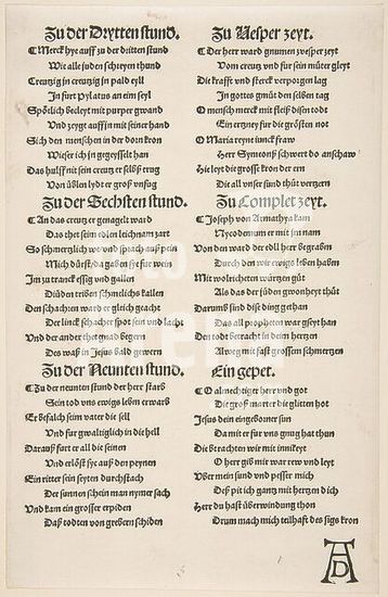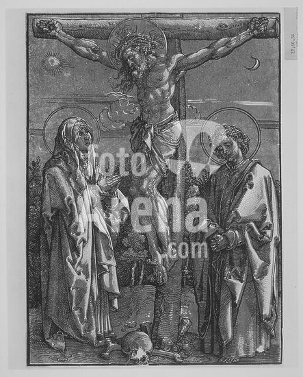 alb3654262 Christ on the Cross with Mary and Saint John (second sheet of two). Artist: Albrecht Dürer (German, Nuremberg 1471-1528 Nuremberg). Dimensions: sheet: 10 x 6 3/8 in. (25.4 x 16.2 cm)plate: 8 1/2 x 5 11/16 in. (21.6 x 14.4 cm). Date: 1510. Museum: Metropolitan Museum of Art, New York, USA.