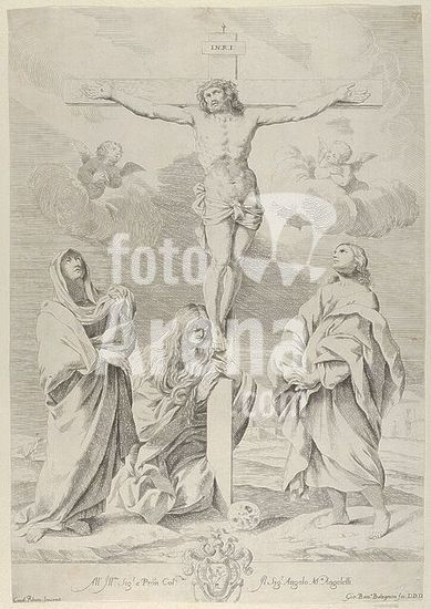 alb3631693 Christ on the cross, Saint John the Baptist at right, Mary Magdelene and the Virgin at left, after Reni. Artist: After Guido Reni (Italian, Bologna 1575-1642 Bologna); Engraved by Gian Battista Bolognini (Italian, Bologna 1611-1688 Bologna). Dimensions: Sheet (Trimmed): 16 5/16 × 11 1/4 in. (41.4 × 28.6 cm). Date: ca. 1640-88.After a painting by Reni which at the time was in the church of San Domenico in Bologna. Verso is not visible as print is laid to another sheet of paper. Museum: Metropolitan Museum of Art, New York, USA.