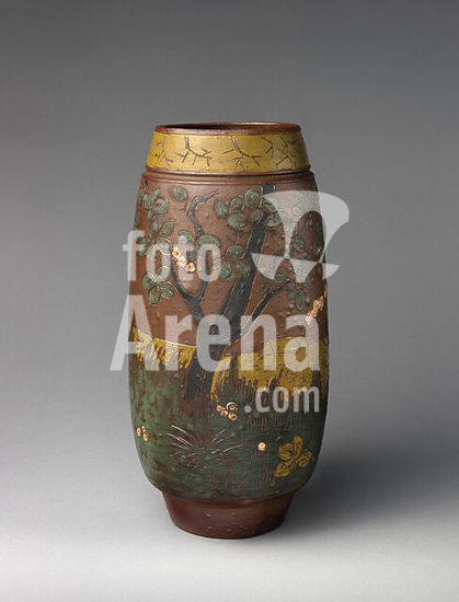 alb3648386 Vase with reaper. Culture: French, Paris. Dimensions: Overall (confirmed): 15 7/16 × 7 3/4 × 7 3/4 in., 9.6 lb. (39.2 × 19.7 × 19.7 cm, 4.4 kg). Factory director: Under the technical direction of Ernest Chaplet (French, Sèvres 1835-1909 Choisy-le-Roi). Manufactory: Haviland & Co. (American and French, 1864-1931). Date: ca. 1885.The cylindrical shape, rough texture, and agricultural theme were inspired by folk pottery from Normandy. The abstract rendering of the woman, with strong incised outlines, makes the piece feel modern. The subject matter of the reaper was popular among some Impressionist painters. Museum: Metropolitan Museum of Art, New York, USA.
