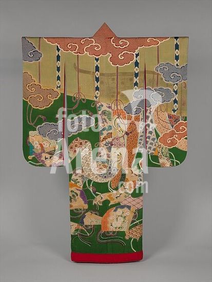 alb3651030 Over Robe (Uchikake) with Design of Bamboo Blinds, Curtain Screens, Decorative Fans, and Auspicous Motifs. Culture: Japan. Dimensions: Overall: 76 x 51 in. (193 x 129.5 cm). Date: ca. 1920s-30s.The stylized clouds, bamboo blinds (misu), minutely decorated curtain screens (kicho), and elaborate fans adorned with colorful strings (hiogi) evoke the golden age of the Heian period (794-1185) court. This type of decorative pattern became fashionable during the second half of the Edo period (1615-1868) among wealthy chonin ladies. It continued to be popular in an altered form into the early twentieth century, with vivid green becoming a favored ground color from the 1910s to 1930s, although there are examples in red and black. The over robe is covered in auspicious motifs. Among the skillfully rendered details are the translucency of the bamboo blinds, the ornamental patterns of the curtain screen, and the individual designs of the fans at the bottom of the robe, which emulate in silk, dyes, and gold leaf the decoration found on paper fans. Museum: Metropolitan Museum of Art, New York, USA.