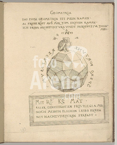 alb3655686 Ein aigentliche und grundtliche anweysung in die Geometria (A True and Thorough Instruction in Geometry). Artist: Augustin Hirschvogel (German, Nuremberg 1503-1553 Vienna). Dimensions: 32.18(1): 7 9/16 × 5 7/8 × 7/16 in. (19.2 × 14.9 × 1.1 cm)32.18(2): 8 × 6 5/16 × 7/16 in. (20.3 × 16 × 1.1 cm). Date: 1543.Hirschvogel begins his small booklet, whose title translates to "A True and Thorough Instruction in Geometry," with a lighthearted verse: The Book of Geometry is my name. / All liberal Arts were originally derived from me. / I reunite Architecture and Perspective. In combination with this etching, an addition to Hirschvogel's volume of illustrations, it helps explain the sixteenth-century fascination with geometry. The etching shows the five Platonic solids--tetrahedron, hexahedron (cube), octahedron, dodecahedron, and icosahedron--which, according to Plato, were the building blocks of the material world and were connected to the four elements: earth, water, air, and fire. In sixteenth-century Germany, heaven was subsequently added as a fifth element, corresponding with the dodecahedron. Hirschvogel went one step further, connecting the polyhedrons and elements with the five vowels of the Latin alphabet, A, E, I, O, and U. It has been suggested that these might be read as one of two possible acronyms alluding to the global reach of Habsburg rule: Austriae Est Imparare Orbi Universo (It is Austria's destiny to rule the world) or Alles Erdreich Ist ...sterreich Untertan (The entire world is subject to Austria). Regardless of whether this last contention is true, Hirschvogel presents us with a holistic vision of the world in which geometry plays the central part. Museum: Metropolitan Museum of Art, New York, USA.