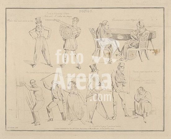 alb3620357 Songs: "Throwing off dull melancholy...". Artist: Henry Thomas Alken (British, London 1785-1851 London). Dimensions: Image: 7 7/8 × 10 in. (20 × 25.4 cm)Sheet: 10 15/16 × 14 15/16 in. (27.8 × 38 cm). Publisher: Thomas McLean (British, active London 1788-1885). Series/Portfolio: Illustrations to Popular Songs. Date: 1822.One sheet of a series of satires, designed as a song book. Composed of vignette scenes, each scene illustrating in a humourous fashion a single line from a popular song of the day. The imagery derives from hunting, shooting and horses, scenes from domestic life, fashion, town and country life, military and naval life. Museum: Metropolitan Museum of Art, New York, USA.