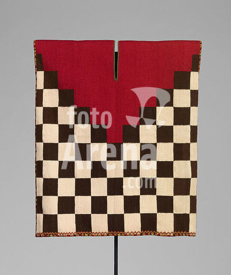 alb3672051 Votive Checkerboard Tunic. Culture: Inca. Dimensions: H. 20 5/8 × W. 16 1/2 in. (52.4 × 41.9 cm). Date: 1460-1626.This small tapestry-woven tunic features a checkerboard pattern with a red V-shaped yoke. Although the design follows the conventions of full-sized garments thought to be associated with the Inca military, its scale suggests that it was destined to adorn a votive figure, a custom practiced in both Inca and colonial Spanish contexts. According to the Spanish chronicler Juan de Betanzos, the Inca dressed certain sacred statues, sometimes the size of a child, in finely woven garments. Miniature checkerboard tunics, smaller than the present example, have been found with small gold, silver, and shell figurines as part of capac hucha or "ritual obligation" offerings, a type of ritual practice designed to extend and unite the vast landscape of the Inca Empire. Despite its smaller scale, this garment includes all of the fine detailing of its full-size counterparts. The checkerboard design is on front and back, inside and out, with meticulously embroidered finished edges. Woven as a single panel with single-interlocking joins, the neck slit was held closed by a temporary weft yarn that was removed after the weaving was complete. Once the finished weaving was cut from the loom, all seams and selvage edges were completely covered with fine double-faced embroidery. The seams were concealed with a precisely repeated series of multicolored bands of different widths. As with the full-size versions, along the bottom, just above that embroidered edge, a discreetly proportioned zigzag was created with similarly colored yarns. Museum: Metropolitan Museum of Art, New York, USA.