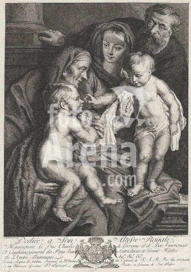 alb3673544 The Holy Family with Saint Elizabeth and the infant Saint John the Baptist. Artist: After Peter Paul Rubens (Flemish, Siegen 1577-1640 Antwerp); Phillip Joseph Tassaert (Flemish, Antwerp 1732-1803 London). Dimensions: Sheet (Trimmed): 14 in. × 13 7/16 in. (35.5 × 34.2 cm). Date: ca. 1615-75. Museum: Metropolitan Museum of Art, New York, USA. Author: After Peter Paul Rubens. Phillip Joseph Tassaert.