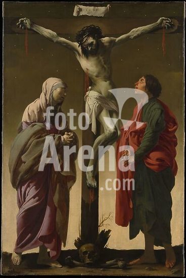 alb3674028 The Crucifixion with the Virgin and Saint John. Artist: Hendrick ter Brugghen (Dutch, The Hague? 1588-1629 Utrecht). Dimensions: 61 x 40 1/4 in. (154.9 x 102.2 cm). Date: ca. 1624-25.This powerful image was probably painted for a Catholic "hidden church" in Ter Brugghen's city of Utrecht, where Catholicism was tolerated but not encouraged. The artist, a Protestant, recaptures the devotional intensity of earlier German and Dutch altarpieces in his stark composition and in the angular figure of Christ. However, the rhythmic draperies, convincing volumes, and folkish figures of Mary and John recall Ter Brugghen's experience of Caravaggio in Rome. The color combinations and hypnotic light are very much his own. Museum: Metropolitan Museum of Art, New York, USA.