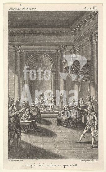 alb3674254 A man seated in a chair on a stepped platform holds an audience, two pointing men stand in the foreground, from a series of five illustrations after Jacques Philippe Joseph de Saint-Quentin for 'The mad day, or the marriage of Figaro' (La Folle journée, ou le mariage de Figaro) by Pierre Augustin Caron de Beaumarchais. Artist: After Jacques Philippe Joseph de Saint Quentin (French, born Paris, 1738); Claude Nicolas Malapeau (French, Paris 1755-1803 Paris). Dimensions: sheet: 6 7/16 x 3 15/16 in. (16.4 x 10 cm). Series/Portfolio: Five illustrations after Jacques Philippe Joseph de Saint-Quentin for 'The mad day, or the marriage of Figaro' (La Folle journée, ou le mariage de Figaro) by Pierre Augustin Caron de Beaumarchais. Date: ca. 1784. Museum: Metropolitan Museum of Art, New York, USA.
