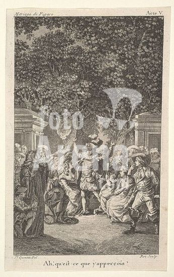 alb3674725 A young boy holds a torch under trees in a garden, at center a man raises both arms, surrounded by male and female figures, from a series of five illustrations after Jacques Philippe Joseph de Saint-Quentin for 'The mad day, or the marriage of Figaro' (La Folle journée, ou le mariage de Figaro) by Pierre Augustin Caron de Beaumarchais. Artist: After Jacques Philippe Joseph de Saint Quentin (French, born Paris, 1738); Claude Nicolas Malapeau (French, Paris 1755-1803 Paris). Dimensions: sheet: 6 5/16 x 3 15/16 in. (16.1 x 10 cm). Series/Portfolio: Five illustrations after Jacques Philippe Joseph de Saint-Quentin for 'The mad day, or the marriage of Figaro' (La Folle journée, ou le mariage de Figaro) by Pierre Augustin Caron de Beaumarchais. Date: ca. 1784. Museum: Metropolitan Museum of Art, New York, USA.