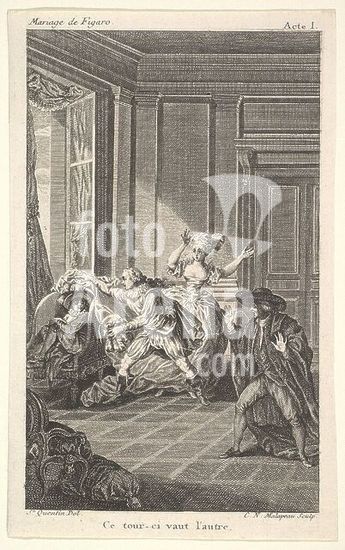 alb3678811 A man curled up in a chair looks toward another man who approaches him from the left in an interior setting, a woman and a man stand nearby with their hands raised, from a series of five illustrations after Jacques Philippe Joseph de Saint-Quentin for 'The mad day, or the marriage of Figaro' (La Folle journée, ou le mariage de Figaro) by Pierre Augustin Caron de Beaumarchais. Artist: After Jacques Philippe Joseph de Saint Quentin (French, born Paris, 1738); Claude Nicolas Malapeau (French, Paris 1755-1803 Paris). Dimensions: sheet: 6 5/16 x 3 9/16 in. (16 x 9 cm). Series/Portfolio: Five illustrations after Jacques Philippe Joseph de Saint-Quentin for 'The mad day, or the marriage of Figaro' (La Folle journée, ou le mariage de Figaro) by Pierre Augustin Caron de Beaumarchais. Date: ca. 1784. Museum: Metropolitan Museum of Art, New York, USA.