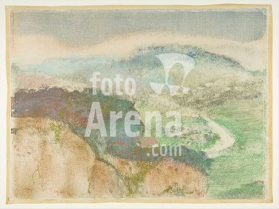 alb3683724 Landscape. Artist: Edgar Degas (French, Paris 1834-1917 Paris). Dimensions: sheet: 10 x 13 3/8 in. (25.4 x 34 cm). Date: 1892.Degas undertook a series of landscape monotypes during a visit in October 1890 to the Burgundian estate of his friend, the artist Pierre-Georges Jeanniot. Over the course of the next two years, he made about fifty monotypes, a group of which he exhibited at the Durand-Ruel gallery in 1892. Although the artist called these views "imaginary landscapes," the present work is thought to reflect his experience traveling through Burgundy in a horse-drawn carriage. Using colored oil paints, overlaid with scumbled pastels, Degas produced a view of a mountainous landscape, partially obscured by mist, which verges on abstraction. Museum: Metropolitan Museum of Art, New York, USA.