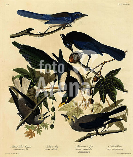 alb3714309 Yellow-billed Magpie, Stellers Jay, Ultramarine Jay and Clark's Crow. Dated: 1837. Dimensions: plate: 66 x 55.9 cm (26 x 22 in.) sheet: 100.3 x 67.6 cm (39 1/2 x 26 5/8 in.). Medium: hand-colored etching and aquatint on Whatman paper. Museum: National Gallery of Art, Washington DC. Author: Robert Havell after John James Audubon.