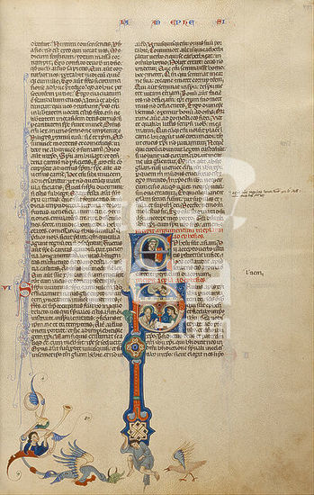alb3889273 Initial P: Saint Paul Giving a Letter to a Messenger. Date/Period: Ca. 1280 - 1290. Folio. Tempera colors, gold leaf, and ink on parchment. Height: 375 mm (14.76 in); Width: 248 mm (9.76 in). Author: UNKNOWN.