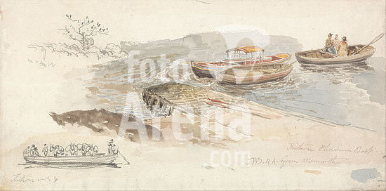 alb3901381 A Canopied Boat and Two Rowing Boats at a Jetty; Inset Left, a Pencil Study of the Tintern Livestock Ferry-boat. Drawing. Graphite and watercolor on medium, smooth, cream wove paper. Height: 171 mm (6.73 in); Width: 343 mm (13.50 in). Author: James Ward.