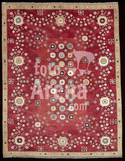 alb4212505 Carpet. Designed by Märta Måås-Fjetterström (Swedish, 1873-1941); Executed by Barbro Nilsson (Swedish, 1899-1993) and the Märta Måås-Fjetterström Workshop; Sweden, Båstad. Date: 1944. Dimensions: 261.5 x 197.8 cm (103 x 77 7/8 in.). Linen and wool, plain weave with supplementary wrapping wefts forming cut pile through a technique known as "Ghiordes Knots," knotted warp fringe. Origin: Sweden. Museum: The Chicago Art Institute, USA.
