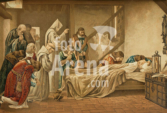 alb5357658 Christopher Columbus (1451-1506). Navigator, cartographer, admiral, viceroy and colonist of the Americas. Death of Christopher Columbus (painting by Francisco Ortega). Illustration by J. Alaminos. Chromolithography. Historia General de España (General History of Spain), by Miguel Morayta. Volume III. Madrid, 1890. Author: Juan Alaminos. Spanish artist of the second half of the 19th century.