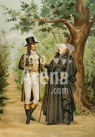 alb5433382 The El Escorial Conspiracy, 1807. Foiled conspiracy led by the Prince of Asturias, Ferdinand of Bourbon, to bring about the fall of Manuel Godoy and put Queen Maria Luisa of Parma under control. Meeting between canon Juan Escóiquiz Morata (1747-1820) and the ambassador of the French Empire in Madrid, François de Beauharnais (1714-1800) to gain Napoleon's support. 1807. Chromolithography. "Historia General de España" (General History of Spain), by Miguel Morayta. Volume V. Madrid, 1891.