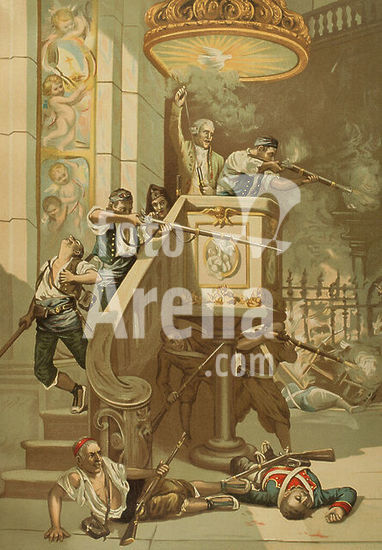 alb5433395 History of Spain. War of Independence (1808-1814). Second Siege of Saragossa (20 December 1808 to 21 February 1809). Heroic combat in the pulpit of the church of San Agustin in Saragossa during the second siege of 1809. Illustration based on the painting by César Alvarez Dumont in 1887. Chromolithography. "Historia General de España" (General History of Spain), by Miguel Morayta. Volume VI. Madrid, 1892.