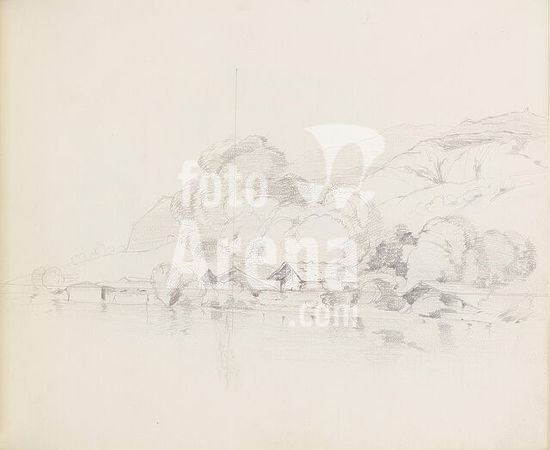 alb9528935 Landscape scene of a series of small domestic buildings on a lake. A vertical and horizontal axis drawn slightly left of center. Mountains slope down to the shore, with a few buildings along the shore. Date: ca. 1895. Graphite on white paper. Museum: Cooper Hewitt, Smithsonian Design Museum.