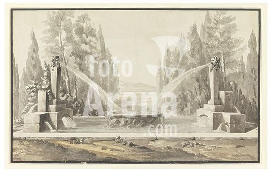 alb9529175 A circular bowl stands in the center of an oblong basin. A fountain springs in its center, and water pours into it from the mouths of two satyr masks at the top of the hermae. These stand upon dados, from which water pours into the basin at several places. Groups of trees are behind the fountain, permitting, in the middle, a view into the open country. Black framing line. Date: ca. 1790. Black chalk, brush and watercolor on paper, mounted. Museum: Cooper Hewitt, Smithsonian Design Museum.