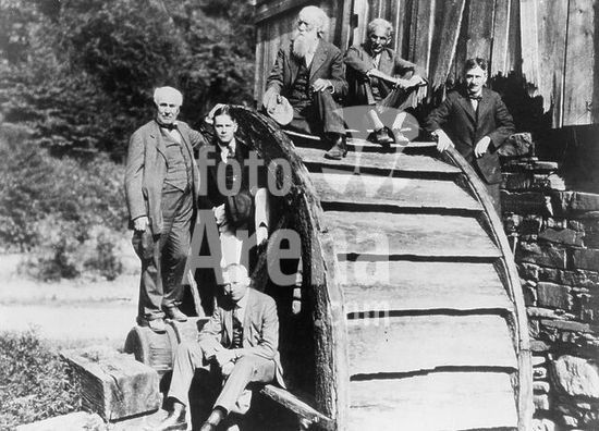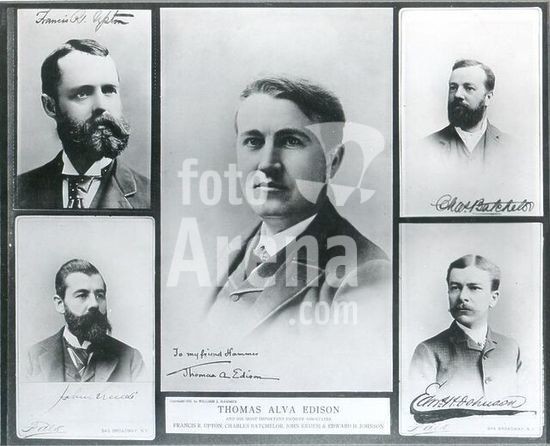 akg914786 Thomas Edison with the dynamo that generated the first commercial electric light, New York City. Printed halftone reproduction of a photograph.