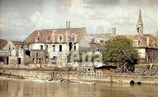 akg1539334 World War I, Western Front, France-Carts along the embankment of the Aisne. The tower of the Saint-Waast Church is seen in the background. On the left damaged building of the Pharmacie Së-Waast. Soissons was occupied twice by German troops during World War I and was heavily damaged by artillery fire. Soissons, Aisne, 1917.-Color photo, ...