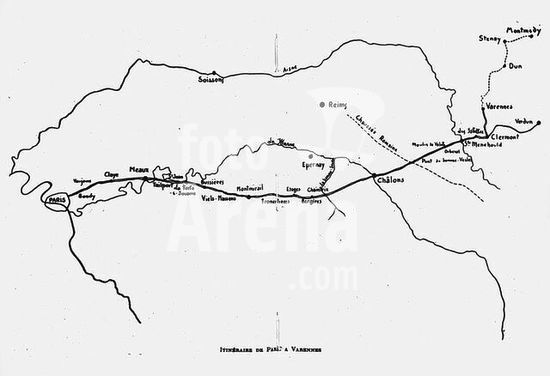 akg242408 Louis XVI, roi de France; Versailles 23. 8.1754 - (guillotiné à) Paris 21.1.1793. "Itinéraire de Paris à Varennes" (Fuite de Louis XVI dans la nuit du 20 au 21 juin 1791 et arrestation à Varennes le 22 juin: croquis de l'itinéraire prévu de Paris à Varennes).