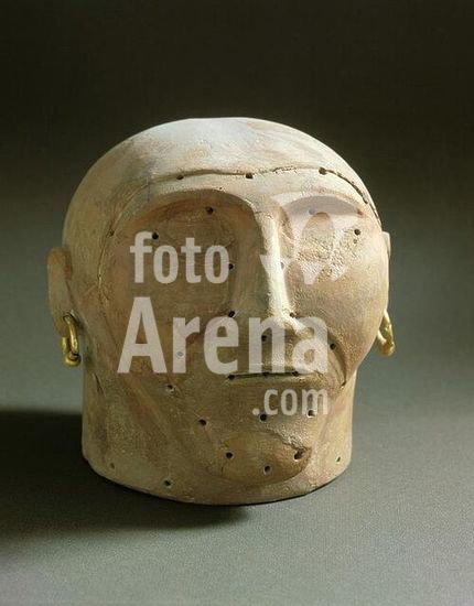 akg431807 Etruscan, c. 600 BC. Anthropomorphic canopic lid in the shape of a female head. Terracotta, bronze mask belonging to it removed. Origin: Dolciano (Tuscany, Italy). Florence, Museo Archeologico. Museum: Florence, Museo Archeologico.
