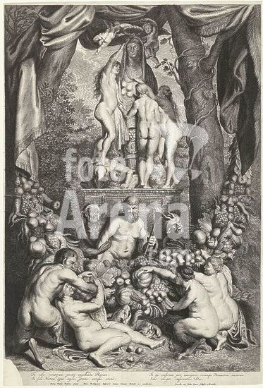 alb15449699 Dalen, Cornelis van (II), Rubens, Peter Paul, Amsterdam, Allegory of Nature, verso - stamped, Allegory of Nature with nymphs honoring bust of Diana with many breasts. In front of the plinth of the statue sit Bacchus, nymphs and female and male satyrs who pick vegetables and fruit from a large garland from which animals also eat., print, prints, height 636 mm, width 431 mm, Noord-Nederlands, 1638-12-28 - 1664-10-09, print maker, printmaker, 1648 - 1664, paper, papier, engraving, engraving (printing process), Zuid-Nederlands, 1577-06-28 - 1640-05-30, after, after a painting by, Publication (Event), Publication, publisher.