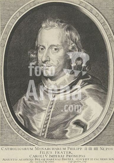 alb15743455 Portrait of Ferdinand of Austria, Portrait of Ferdinand of Austria - nicknamed Cardinal-Infante - Governor of the Southern Netherlands. Below the portrait are name and titles., print, print maker: Crispijn van den Queborn, (mentioned on object), after painting by: Anthony van Dyck, (mentioned on object), The Hague, 1624 - 1652, paper, engraving, height, 411 mm × width, 295 mm.