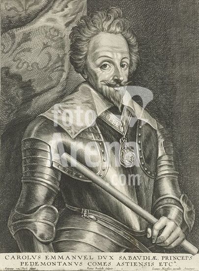 alb15746871 Portrait of Charles Emanuel I, Portrait of Charles Emanuel I, Duke of Savoy. He is dressed in armor and has a stick in his hand., print, print maker: Petrus Rucholle, (mentioned on object), after painting by: Anthony van Dyck, (mentioned on object), publisher: Joannes Meyssens, (mentioned on object), Antwerp, 1640 - 1670, paper, engraving, height, 242 mm × width, 181 mm.