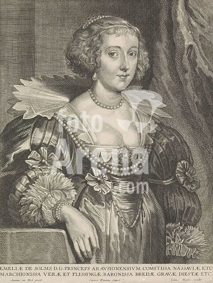 alb15757132 Portrait of Amalia van Solms, Emeliae de Solms, D.G. Princeps Aravsionensivm (...) (title on object), Portrait of Amalia. Two lines of Latin text in the bottom margin., print, print maker: Coenraet Waumans, (mentioned on object), after painting by: Anthony van Dyck, (mentioned on object), publisher: Joannes Meyssens, (mentioned on object), print maker: Southern Netherlands, publisher: Antwerp, c. 1640 - c. 1641, paper, engraving, height, 256 mm × width, 198 mm.