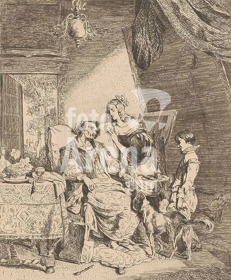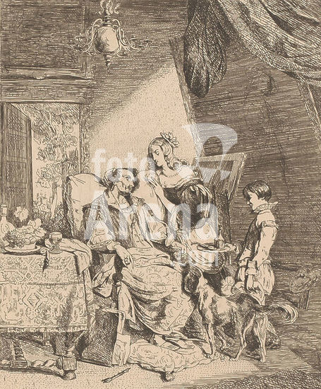 alb15855816 Anthony van Dyck on his deathbed, Van Dyck sits in a large chair at a table surrounded by a woman, a boy with a tray of medicine and a dog., print maker: Emanuel Noterman, after painting by: Pierre Kremer, 1818 - 1863, paper, etching, height 267 mm × width 215 mm, print.