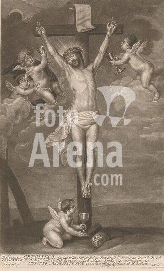 alb15852934 Christ on the cross, around the cross four putti that collect his blood in chalices., print maker: Isaac Beckett, after painting by: Anthony van Dyck, publisher: John Smith (prentmaker/ uitgever), London, c. 1681 - c. 1688, paper, height 286 mm × width 178 mm, print.