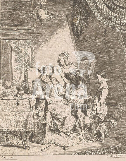 alb15757467 Anthony van Dyck on his deathbed, Van Dyck sits in a large chair at a table surrounded by a woman, a boy with a tray of medicine and a dog., print, print maker: Emanuel Noterman, (mentioned on object), after painting by: Pierre Kremer, (mentioned on object), 1818 - 1863, paper, etching, height, 266 mm × width, 201 mm.