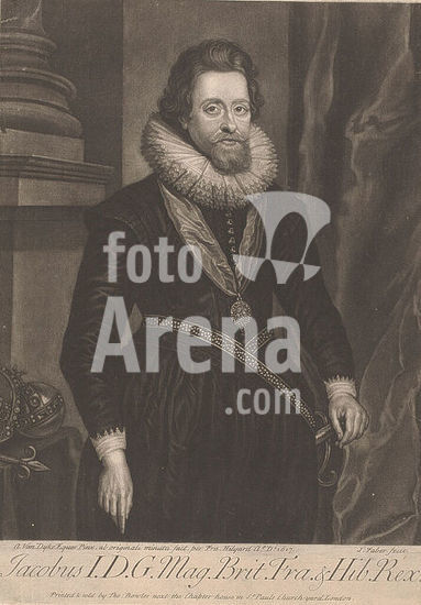 alb15875486 Portrait of James I, King of England, print maker: John Faber (II), after painting by: Anthony van Dyck, printer: Thomas Bowles (II), 1715 - 1766, paper, height 350 mm × width 252 mm, print.