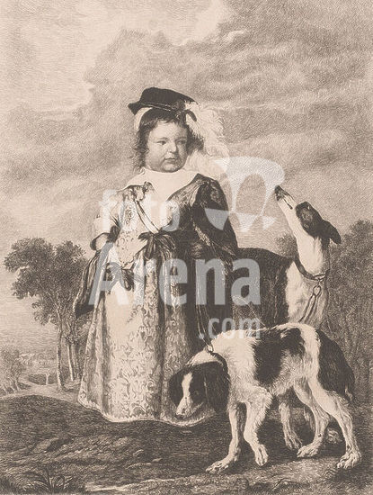 alb15880368 Portrait of an unknown child with two dogs, print maker: Charles Théodore Bernier, (signed by artist), after painting by: Anthony van Dyck, 1890, paper, etching, height 270 mm × width 216 mm, print.