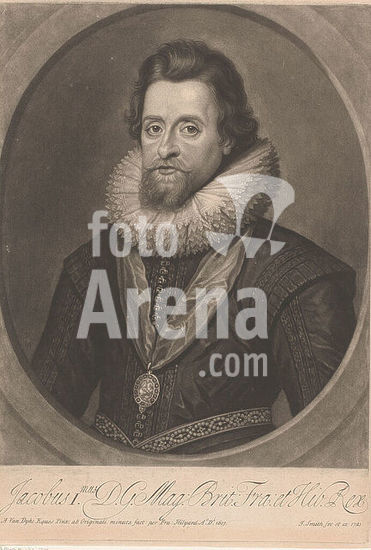 alb15930316 Portrait of James I, King of England, print maker: John Smith (prentmaker/ uitgever), after painting by: Anthony van Dyck, publisher: John Smith (prentmaker/ uitgever), 1721, paper, height 351 mm × width 245 mm, print.