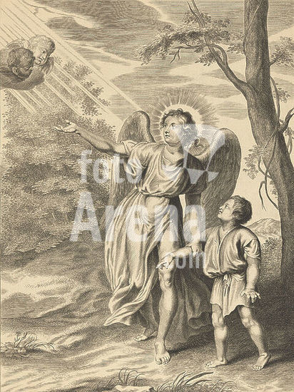 alb15932065 Guardian Angel, S. angelus custos (title on object), A guardian angel carries a boy by his arm. He points to two Cherubim coming down from heaven., print maker: anonymous, after design by: Anthony van Dyck, after painting by: Titiaan, print maker: Low Countries, publisher: Antwerp, 1615 - 1650, paper, engraving, height 427 mm × width 315 mm, print.